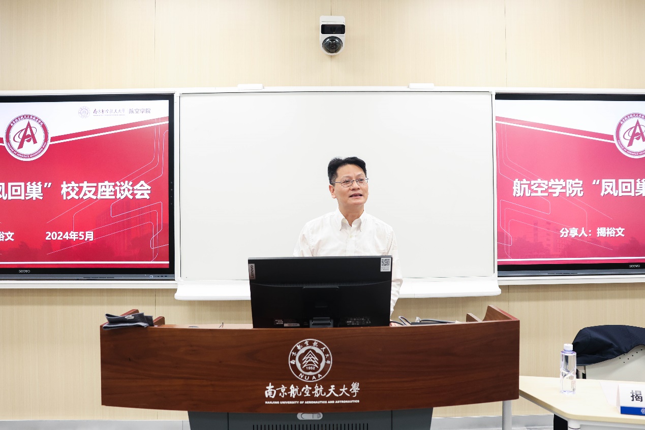 会上,揭裕文院友分享了在南航的求学经历,并对在校大学生的专业学习和人生规划给予宝贵建议。他表示,从高中到大学要迅速转变学习方式,努力提高自身的自学能力,为未来工作奠定了坚实基础。他鼓励大家要保持专注,持续学习,按照100000小时定律去深耕与磨练,才有可能成为某个领域的专家。