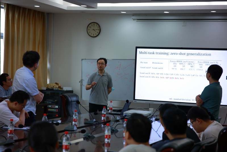 仇虎教授主持了报告会,对王涵研究员的莅临表示热烈欢迎,并详细介绍了其学术背景、研究经历及科研成就。报告中,王涵研究员回顾了原子模拟涉及的薛定谔方程、波恩-奥本海默近似、密度泛函理论、机器学习势等基本原理,介绍了现代微观模拟面临的挑战。他重点阐述了机器学习方法在原子尺度模拟中的应用,尤其是他与合作者所开发的深度势能模型(DeePMD)。他还介绍了团队在开发具有通用性的大原子模型方面的尝试,指出了创建一个跨领域、多任务通用模型所遇到的难题,并展示了DPA-2模型的少数帧泛化能力及其应用,详细解释了相关工作流程。最后,提出了旨在推动大原子模型发展的OpenLAM开源计划倡议,并呼吁大家一起加入。