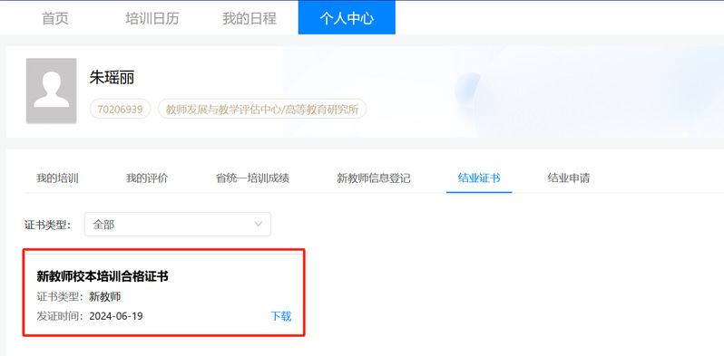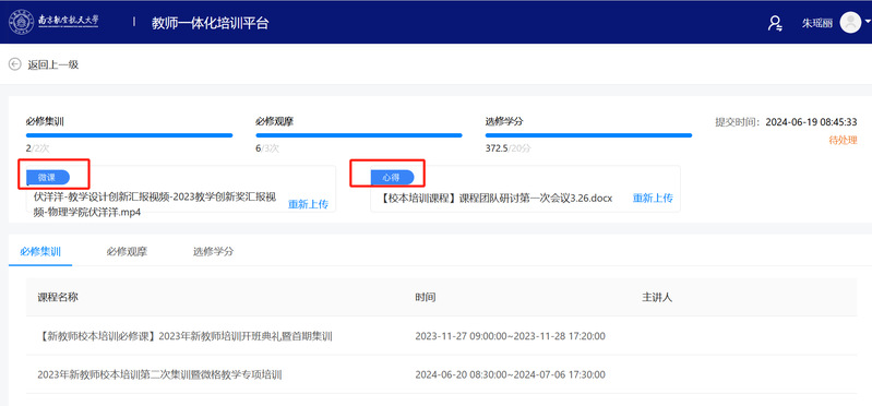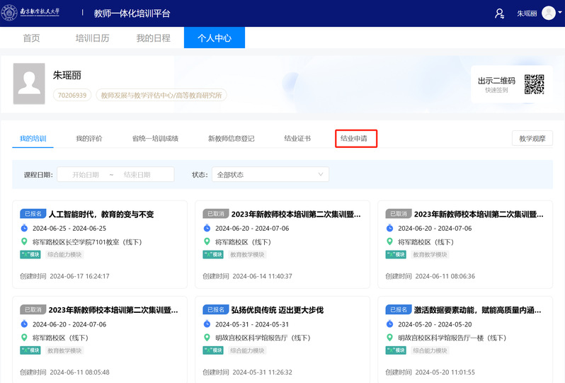满足结业条件的教师请于7月25日前登录“教师一体化培训平台”(http://jspx.nuaa.edu.cn/web)--个人中心—结业申请—新教师结业,完成“微课”(同第3点中的微课作品)和“心得”(模板见附件3)上传,并点击申请结业。学校将在9月前统一审核,审核通过后教师可自行在结业证书里下载电子版校本培训证书,不再发放纸质证书。