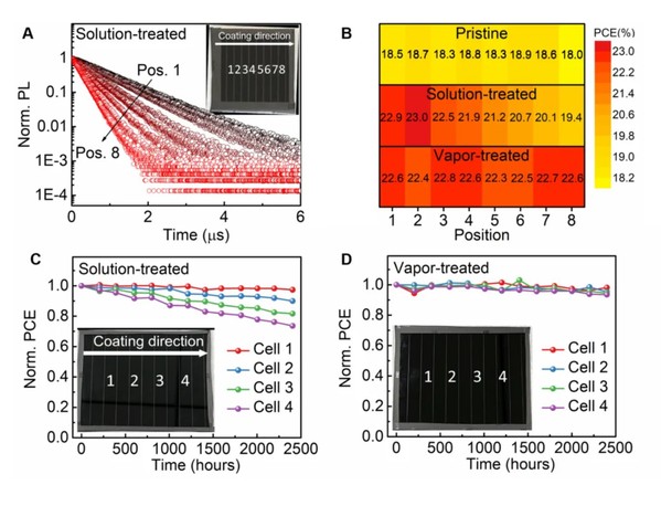 与传统溶液处理方法相比,氟蒸汽处理实现了明显更均匀的表面钝化效果,使得整个薄膜能够大面积均匀展现出长的光致发光寿命,同时显著减少了诱发材料降解的缺陷源,从而在可企及的器件区域内实现了效率的一致提升和模组寿命的大幅延长。
