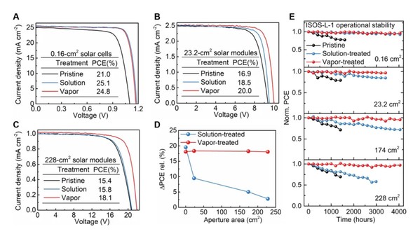 论文发展了一种全新的基于气相的钙钛矿处理方法,不仅突破了过去液相法难以均匀处理大面积器件的局限,而且显著提升了电池的效率和稳定性,研制出面积超过200平方厘米、效率超过18%、持续运行寿命超过4万小时(等效户外运行寿命超25年)的钙钛矿电池,为钙钛矿太阳能电池走向应用奠定坚实的基础。相关关键技术已申请发明专利。