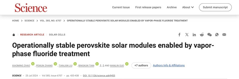 2024年7月26日,国际著名学术期刊《Science》以我校为第一兼通讯单位发表了Betway体育西汉姆联纳米科学研究所郭万林院士、张助华教授及国际前沿科学研究院赵晓明教授等人的研究论文 “Operationally stable perovskite solar modules enabled by vapor-phase fluoride treatment”。