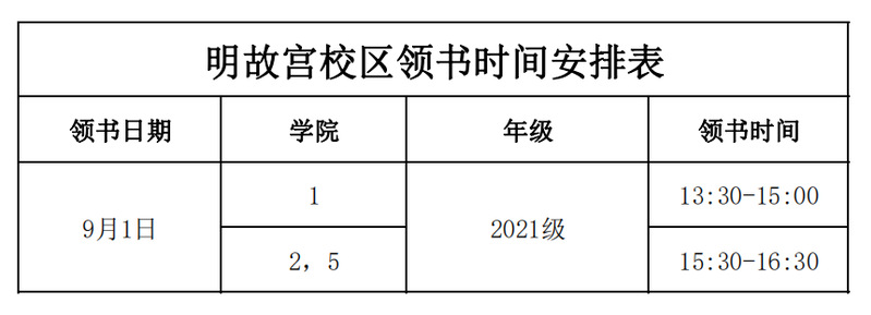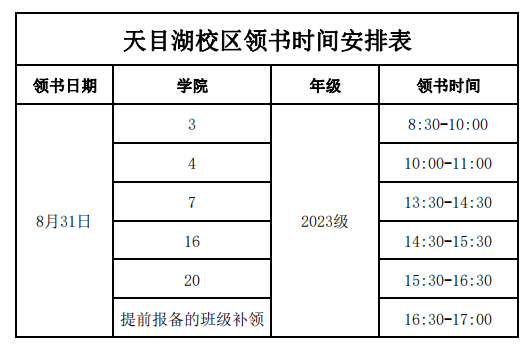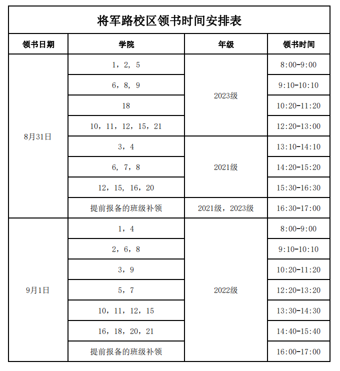 2.请各班在表格中规定的领书时间段前来,每个班领书人数最多不超过4人,原则上每个时间段只接受安排在该时间段的年级领书,请各学院每个年级安排一位同学于规定的时间段内在现场维持秩序,8月28日(周三)前请将负责人姓名和联系方式报给刘老师(将军路校区)和陈老师(天目湖校区)。