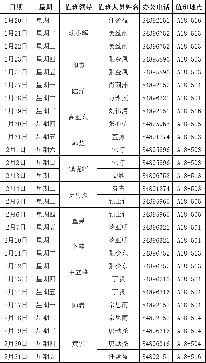 学校总值班自 1月 19日至 2月 22日止,二级单位值班自 1月20 日至 2 月 21 日止(周一至周五及法定节假日)。