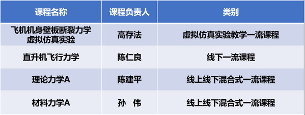 近日,教育部公布了第二批国家级一流本科课程名单。Betway体育西汉姆联4门本科课程获批第二批国家级一流本科课程,获批数量占学校总获批数量的1/4,全校排名第一。其中,由高存法教授负责的《飞机机身壁板断裂力学虚拟仿真实验》获评“虚拟仿真实验教学一流课程”,由陈仁良教授负责的《直升机飞行力学》获评“线下一流课程”,由陈建平教授负责的《理论力学A》和由孙伟副教授负责的《材料力学A》获评“线上线下混合式一流课程”。