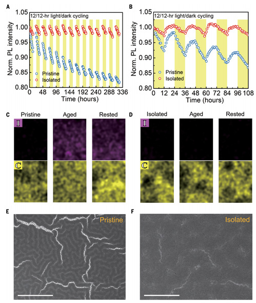 在运行条件下,钙钛矿太阳能电池经历光暗周期,导致循环操作期间出现可逆和不可逆的性能损失。钙钛矿材料的固有软离子晶体结构使得其离子键相对较弱,容易在晶格中形成离子缺陷。此外,由于离子迁移所需的活化能较低,这些缺陷在运行条件下容易移动,最终影响设备的使用寿命。