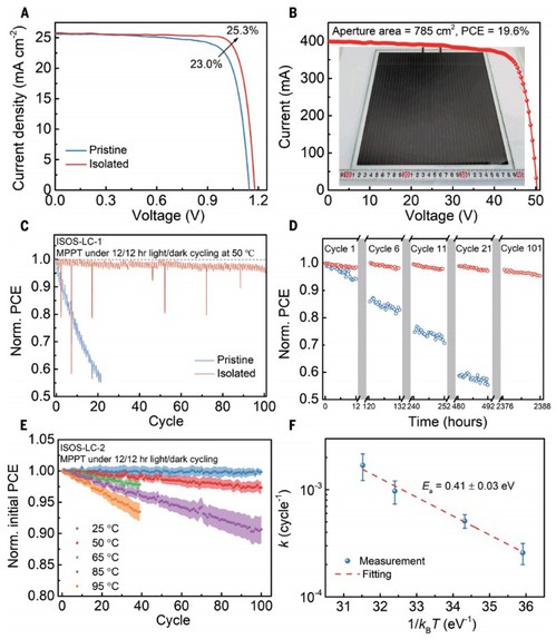 在此,郭万林院士团队通过使用气相沉积的多齿配体在钙钛矿表面隔离有缺陷的八面体结构来解决这一问题。表面八面体的隔离抑制了离子迁移到电荷传输层,并减少了表面离子缺陷,从而调节了在明暗循环过程中离子迁移的动力学。制造的785平方厘米的工业级钙钛矿太阳能组件实现了19.6%的光电转换效率(PCE)。本文的组件展现出增强的日间稳定性,在50°C下经过101次明暗循环后,仍能保持其初始PCE的97%以上。此外,钙钛矿组件在严酷的夏季条件下进行了45天的户外运行测试,期间保持了稳定的电力输出,其稳定性与参考硅电池相当。