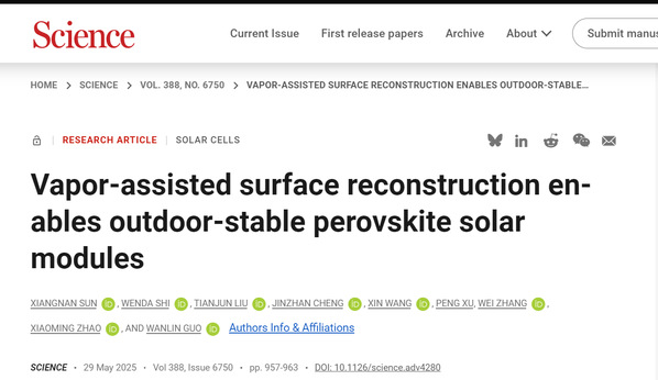 Xiangnan Sun†, Wenda Shi†, Tianjun Liu, Jinzhan Cheng, Xin Wang, Peng Xu, Wei Zhang, Xiaoming Zhao*, Wanlin Guo*,Vapor-assisted surface reconstruction enables outdoor-stable perovskite solar modules, Science, https://www.science.org/doi/10.1126/science.adv4280