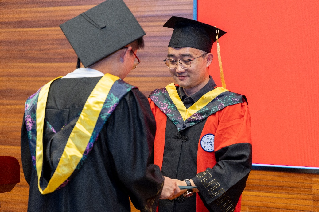 学位授予仪式环节,王立峰、董昊、史志伟、郭宇锋为毕业生拨正流苏、颁发学位证书。