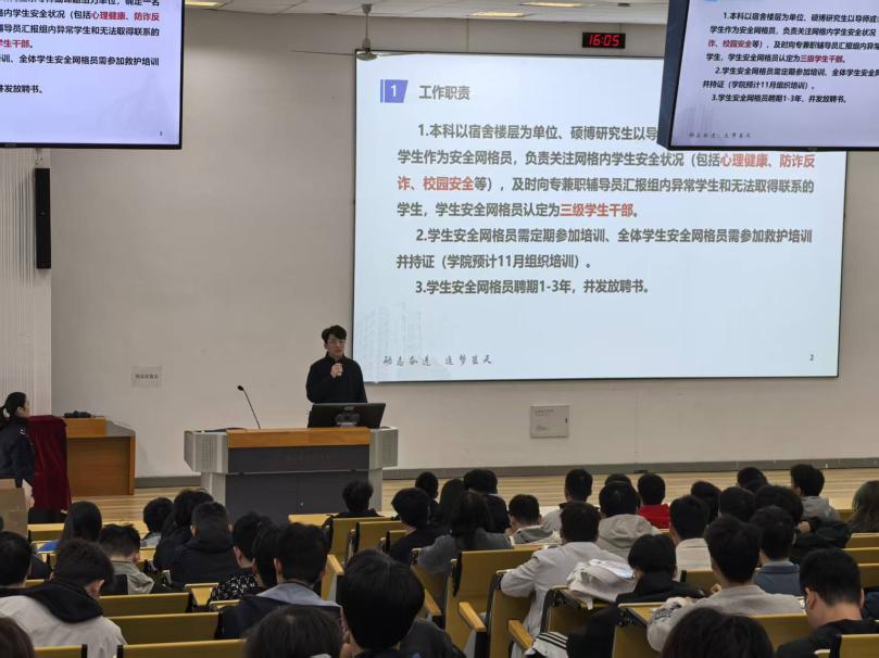 培训伊始,戈程禹老师围绕学生安全网格员的核心职责与履职要求展开专题讲解,从校园安全防控体系的整体架构出发,明确了安全网格员作为“安全防线的‘前哨兵’”这一关键定位。他强调,安全网格员既要做安全知识的“宣传员”,也要做安全隐患的“排查员”,更要做师生沟通的“联络员”,切实为年级安全防控筑牢第一道防线。