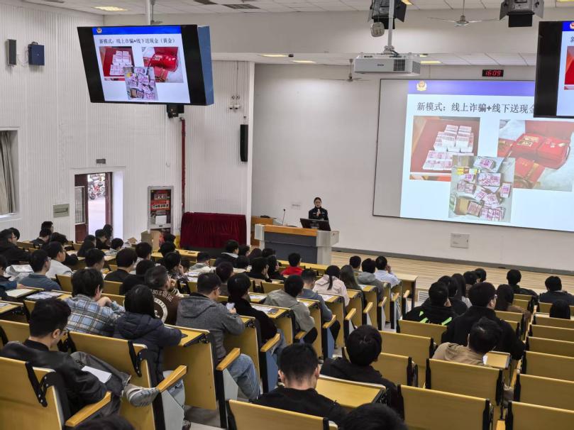 江雨甜警官结合近年来高校电诈案件高发态势,以“精准识诈防诈、共筑安全屏障”为主题展开授课。她通过典型案例复盘、诈骗话术拆解等方式,系统讲解了针对大学生群体的网络刷单、校园贷、冒充客服、网聊约炮等常见电诈类型的核心特征与识别要点。她强调,电信网络诈骗就在身边,安全网格员要立足骨干身份,将反诈知识精准传递到每一位同学。