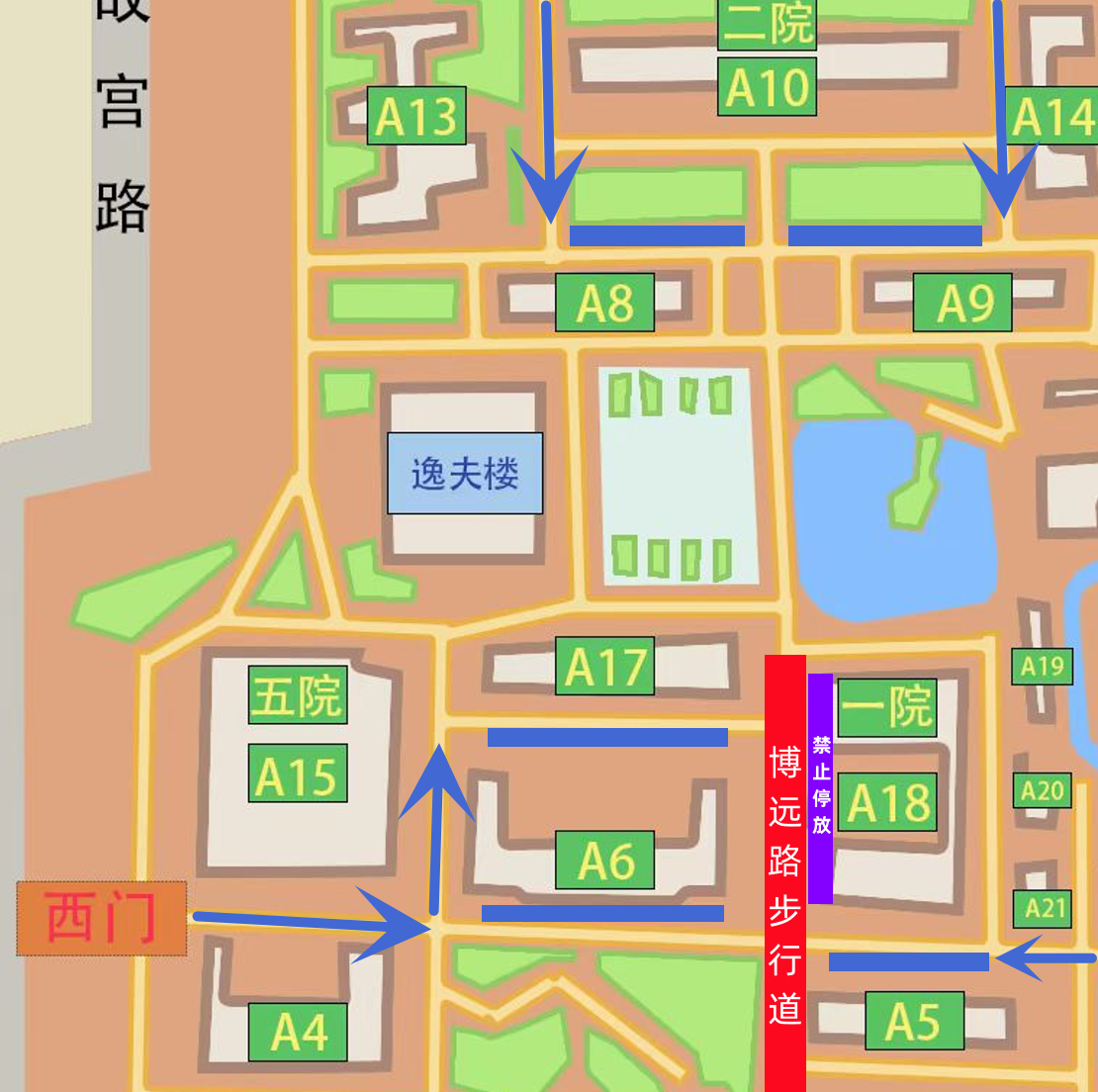 2.自西门和西2门进入的非机动车辆,建议停放在A6、A17号楼前的非机动车停放点;