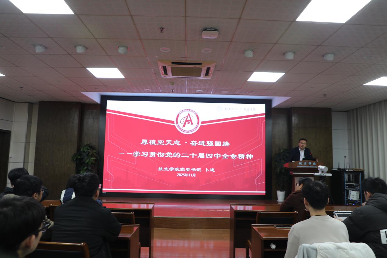 为深入学习贯彻党的二十届四中全会精神,传承航空报国红色基因,筑牢青年学子信仰之基,11月20日,Betway体育西汉姆联2025年秋季入党积极分子、预备党员培训结班报告会在明故宫校区航空宇航楼529报告厅举行,明故宫校区及将军路校区均设有分会场。学院党委书记卜建以“厚植空天志·奋进强国路——学习贯彻党的二十届四中全会精神”为题讲授专题党课,300余名入党积极分子、预备党员参加培训。