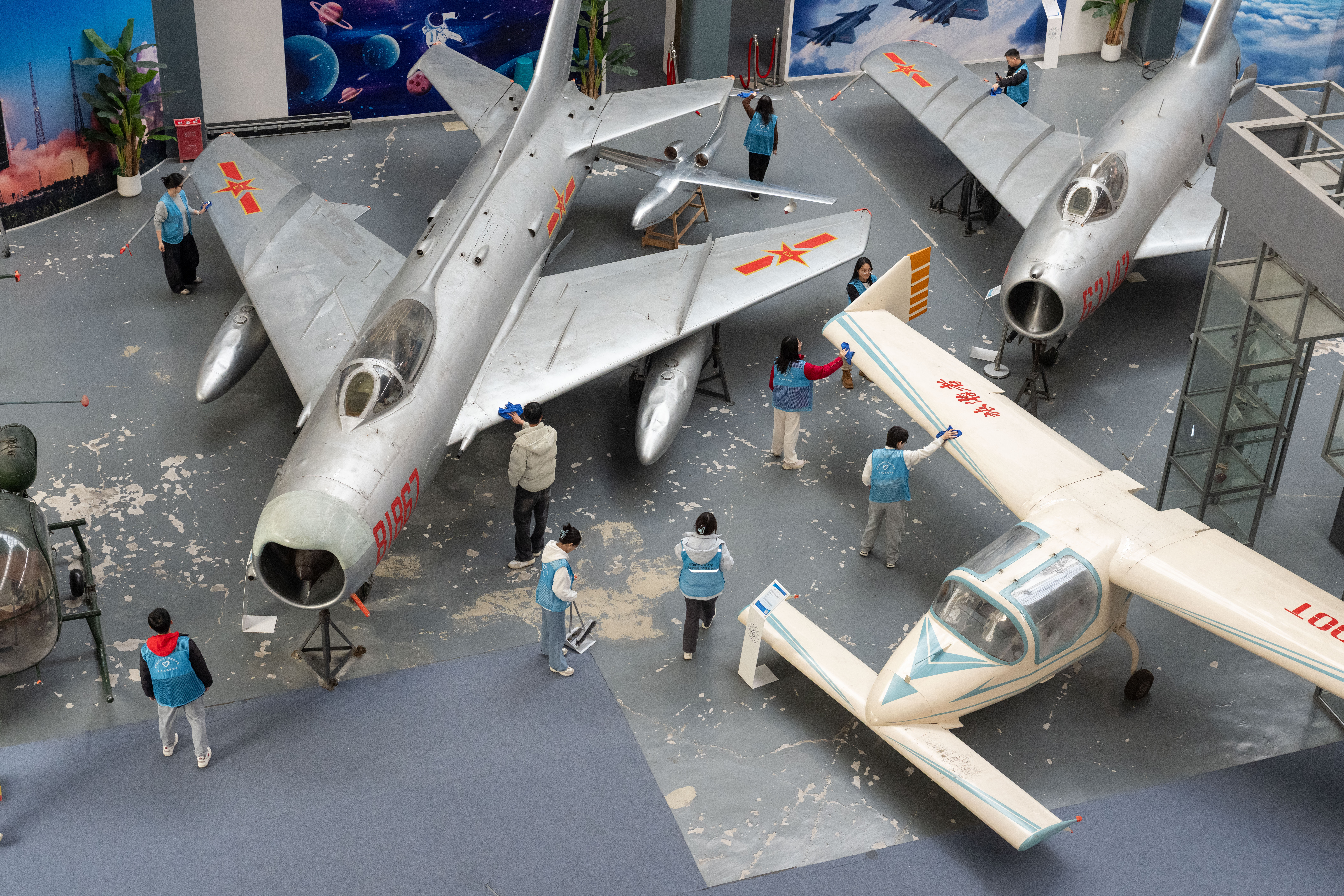 “擦拭展品,就是擦拭民族记忆与先辈荣光。”参观结束后,党员们分工协作、手持工具投入场馆清洁行动。细致清扫地面、轻柔擦拭陈列的飞机及航空部件,认真清理走廊通道,不放过任何卫生死角,用心呵护每一件承载航空梦想的展品,以实际行动诠释劳动之美与党员本色。“触摸战机的瞬间,仿佛与先辈的拼搏隔空对话。”劳动间隙,有党员感慨,这场劳动既是践行“以劳树德、以劳育美”的教育理念,更是以实干缅怀先烈、致敬先辈。清洁后的展馆窗明几净,展品在灯光下更显庄重,不仅为后续参观者提供了整洁的环境,更让“红色基因、蓝色梦想”的种子在实干中生根。