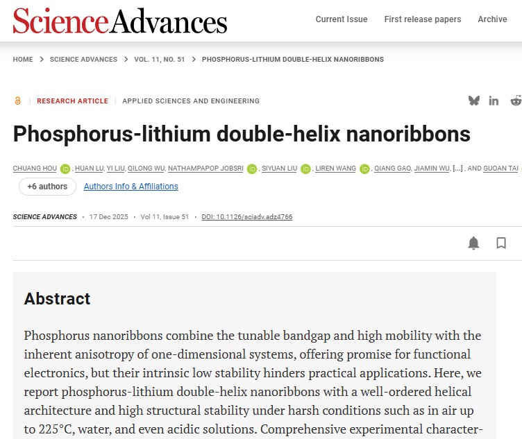 在结构创新与稳定性提升的共同作用下,研究团队系统建立了磷-锂双螺旋一维纳米结构的 “结构—稳定性—功能” 内在关联性,不仅拓展了低维磷材料的结构类型,也为复杂结构在无机低维体系中的构筑提供了新的理论与实验依据。相关成果有望推动低维功能材料在光学、光热及柔性功能器件等方向的进一步研究与发展。