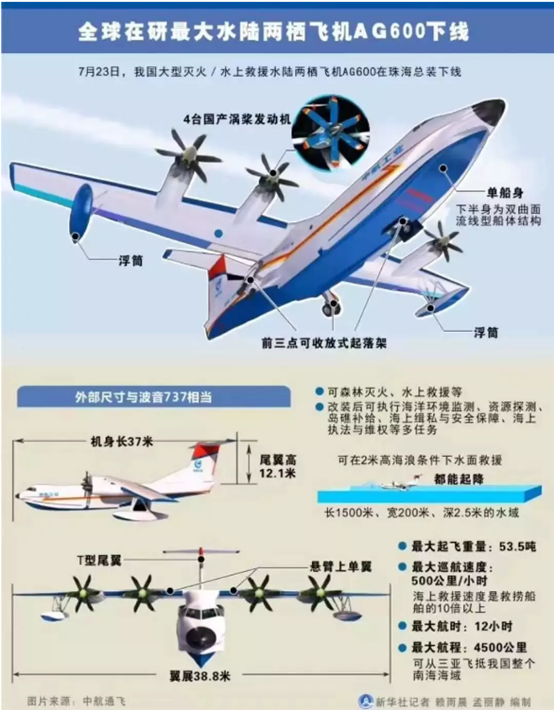 据了解,AG600的最大特点是大、新、奇。它比A320的客机机身长4米,选用新材料、新设计标准,外观奇特,就像一只会飞的船,可说是“海陆空任我行”。它的诞生将解决我国森林灭火、水上救援等方面的迫切需求。